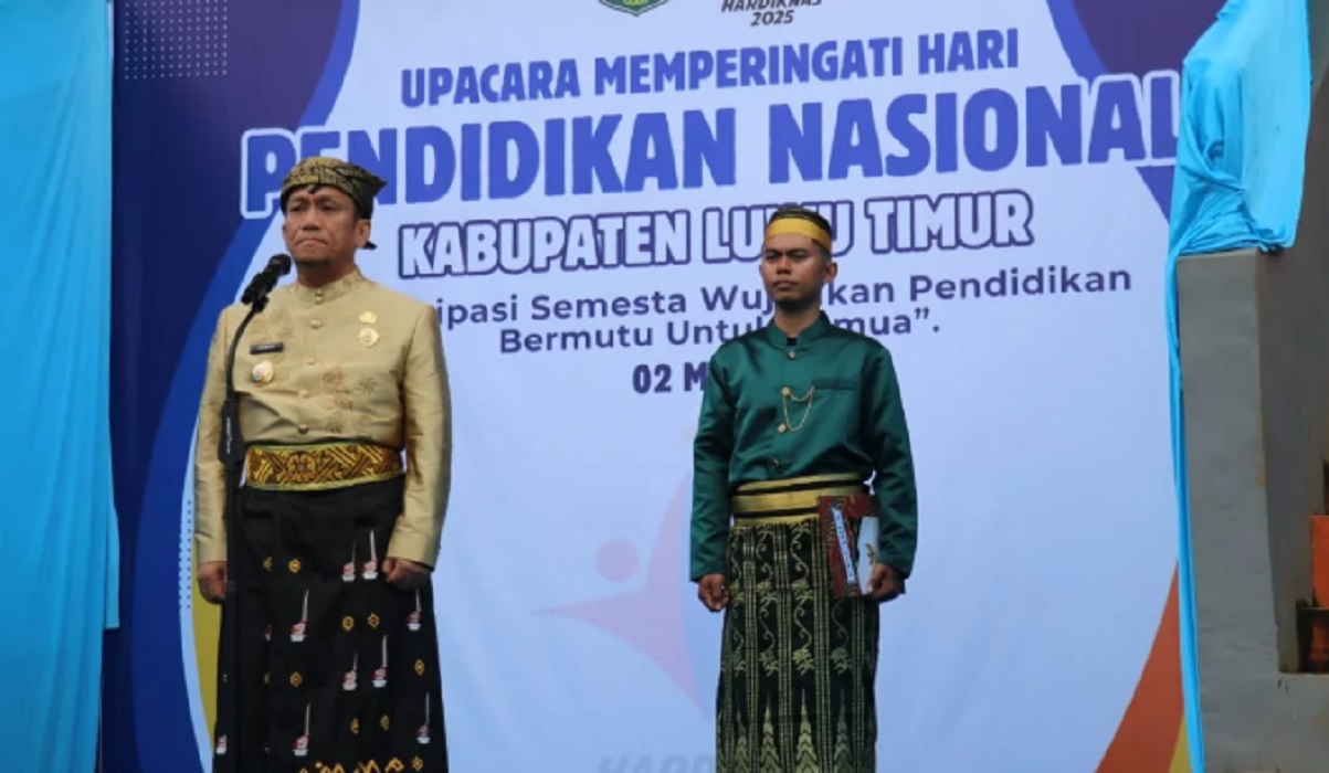 Bupati Luwu Timur, Irwan Bachri Syam, mengumumkan kebijakan baru beasiswa S1 saat upacara Hari Pendidikan Nasional di Wasuponda pada Jumat, 2 Mei 2025.